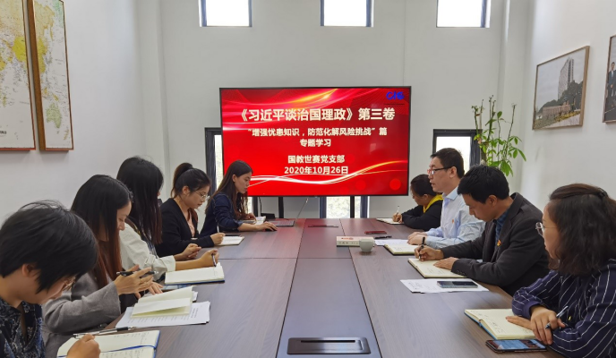 机关党委国教世赛党支部其他党员结合工作实际,围绕《习近平谈治国理政》第三卷的学习体会,进行了交流探讨。通过这次学习,支部党员对于我国当前的困难风险挑战、发展阶段的新机遇新挑战有了更深刻的认识。同时,大家还认识到,每一名党员,都应当以本职工作作为立足点和出发点,将忧患意识、风险观念和底线思维作为严于律己的准绳和不断前进的动力。支部党员纷纷表示,对于涉外教育与世赛研究工作者而言,必须在日常工作中,时刻维护国家形象、坚定政治立场,这是作为党员和人民教师的底线要求。同时,在忧患和风险意识的推动下,要勇于担当、敢于创新、敢于奉献,切实提高破解问题的能力和动力。