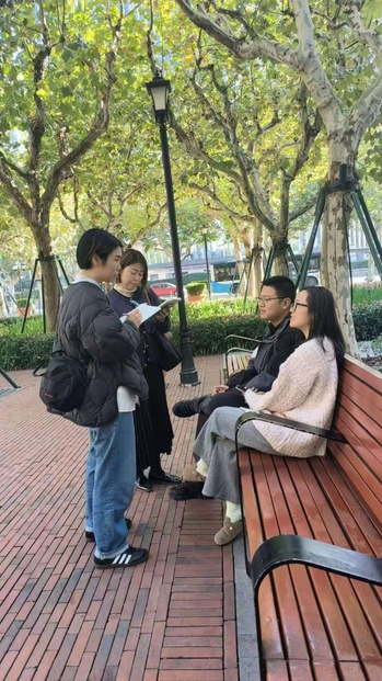 采访当天,各小组在徐家汇书院及其周边区域有序开展采访任务。通过与受访者的对话,员工们不仅在真实语境中练习了口语,还深入了解了中国读者的阅读习惯。起初,员工们猜测年轻人可能比老年人更喜欢电子书,但实际调查结果却恰恰相反——大部分年轻人更倾向于纸质书,而部分老年人则支持电子书。