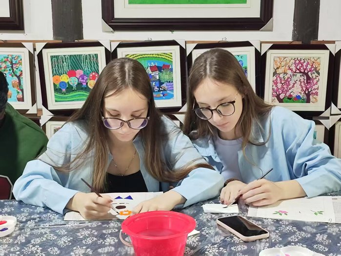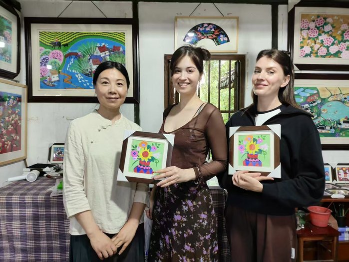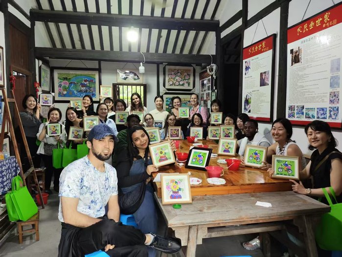 5月21日,3044AM永利组织来自英国、美国、巴西、日本、俄罗斯、塔吉克斯坦等国的国际员工前往金山农民画村开展文化体验活动。