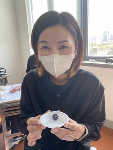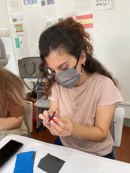 王师军老师首先向国际员工介绍了我国的漆器和漆艺。然后带领大家体验漆珠打磨并设计成精美项链。在自己的耐心打磨下,同学们看到手里黑漆漆的珠子逐渐呈现出蓝、红、金、白的色彩,都兴奋起来。当身旁同学手里的珠子越来越美,越来越圆,有的同学非常羡慕,这时王老师告诉大家,漆器工艺慢就是快,只有慢慢打磨,才能让它绽放出独一无二的光彩。